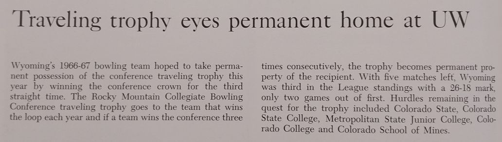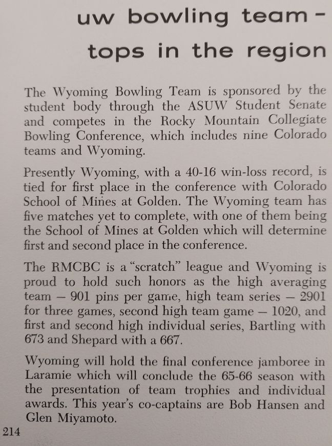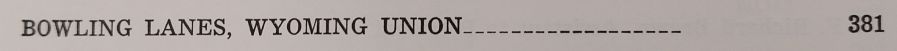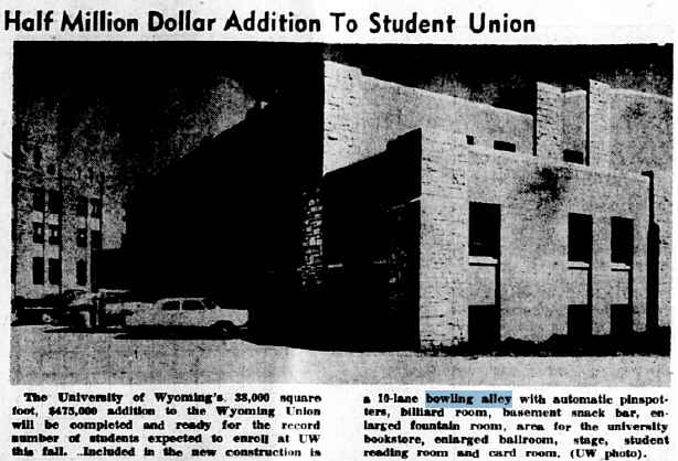 | Factoids: | The Wyoming Union Bowling Lanes was not listed in the December 1960-1961 Campus Directory but photos appear in the 1960 WYO yearbook. |