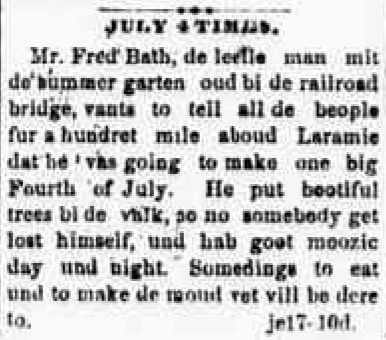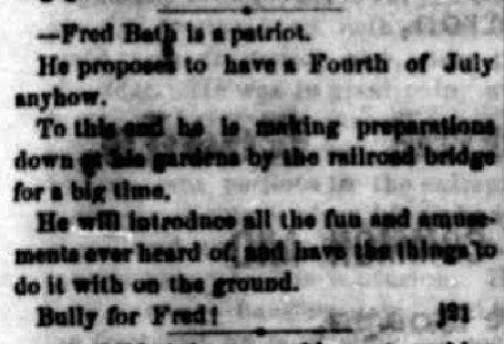On June 14, 1873, to celebrate the Grand Opening of his new brewery, Fred put on a summer extravaganza at his Summer Gardens down near the railroad bridge. A few weeks later, to celebrate the 97th anniversary of America's Independence, Fred held a July 4th celebration that included a bowling alley at his Summer Gardens. I'm fairly positive this alley was a ten pinnet or box ball type, or some other arcade contraption since it was a temporary celebration. |