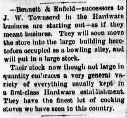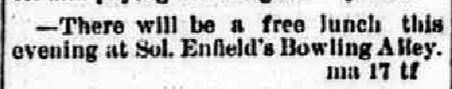 Solomon Enfield constructed a building on (South) Second Street that would include a saloon and bowling alley in the fall of 1874.