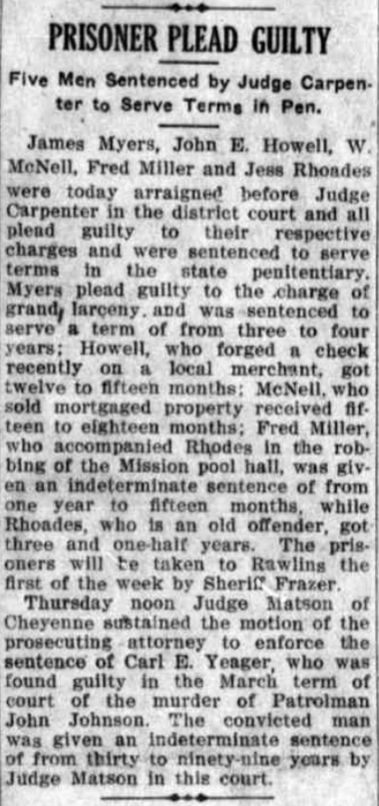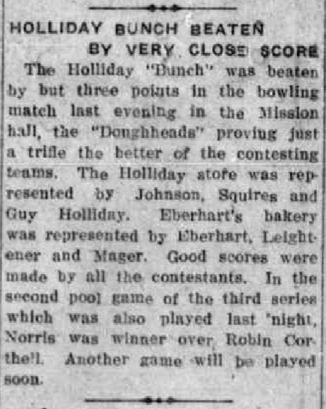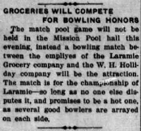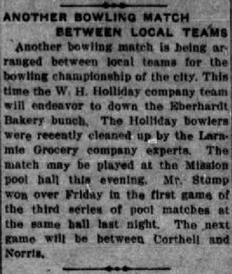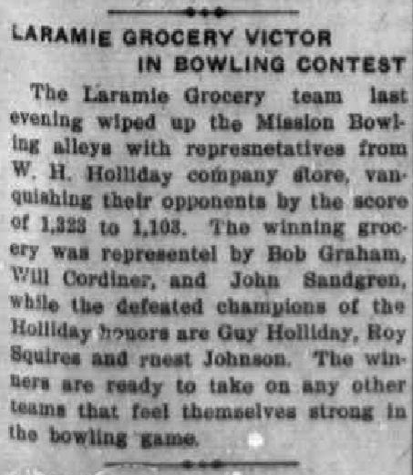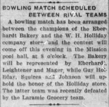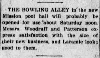 In July 1911, the pool and billiard hall was opened to the public, the bowling alley would take another week or so to be completed. The bowling alley in the new Mission Pool Hall was operational in early August 1911. In September 1911, G. L. Sears, an employee at the Mission Pool Hall, resigned and returned to Greeley CO. In October 1911, Wayne B. Patterson sold his interest in the Mission Pool Hall to his partner, W. H. Woodruff. Jess Rhodes and Fred Miller are guilty of robbing the Mission amusement and pool hall in January 1912. On February 22, 1912, Harry Larson and A. R. Meahl purchase the Mission pool hall from W. H. Woodruff. During the early half of 1912, numerous bowling matches took place between several Laramie business, including but not limited to: Laramie Grocery company, Eberhardt Bakery and the W. H. Holliday company. There was a month long pool and bowling tournament in December 1912, the last signals of bowling at this location. In late December 1912, John Potts purchases Mr. Meahl's interest in the Mission pool hall. The Mission Pool hall eventually moved into the Durlacher room (formerly occupied by the "No Name" store) at 205 S 2nd Street in June 1913. At this time, I suspect the alley was likely an arcade contraption similar to the previous Laramie alleys. |