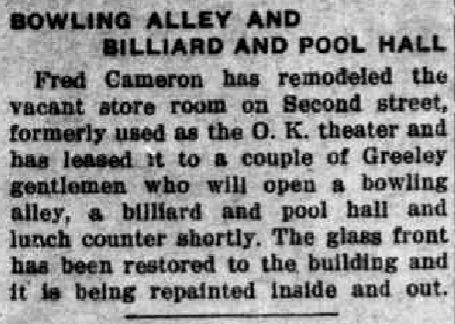 Fred Cameron remodels the empty storeroom formerly used as the O. K. Theatre and leases it to Woodruff and Patterson, two Greeley (Colorado) gentlemen.