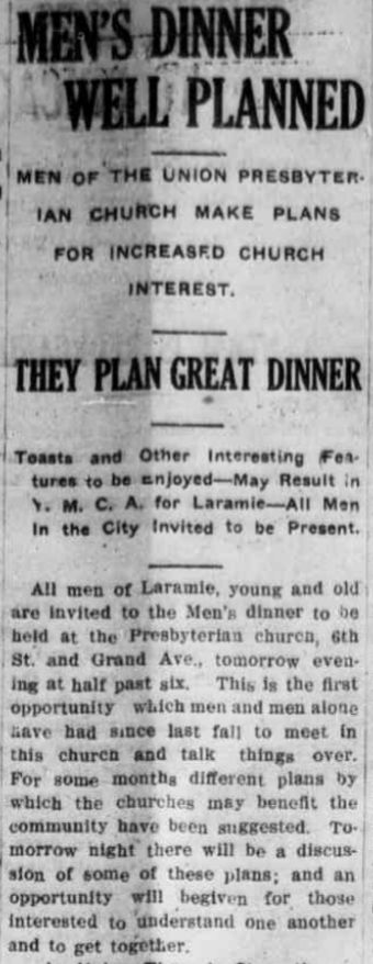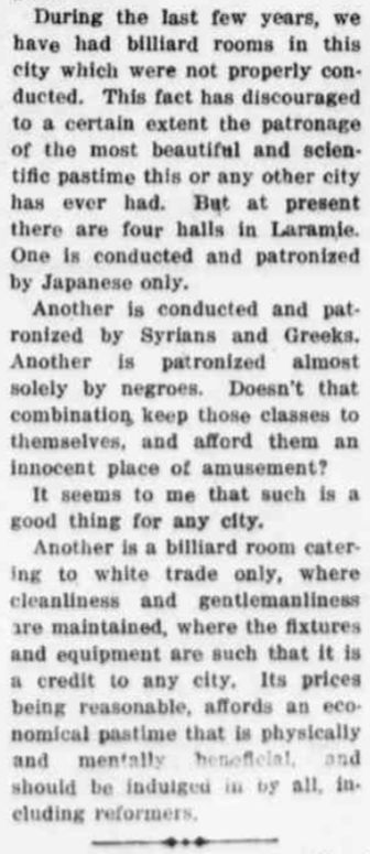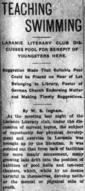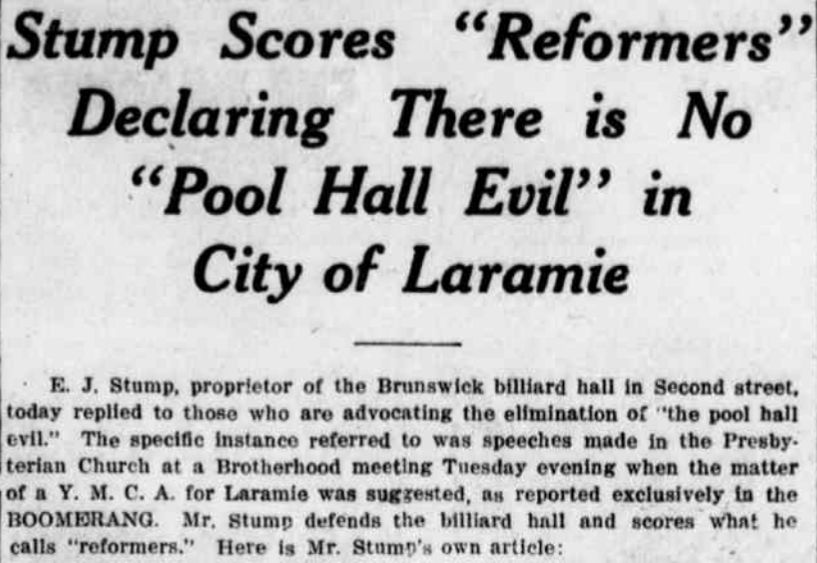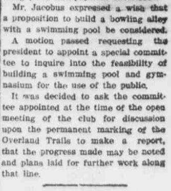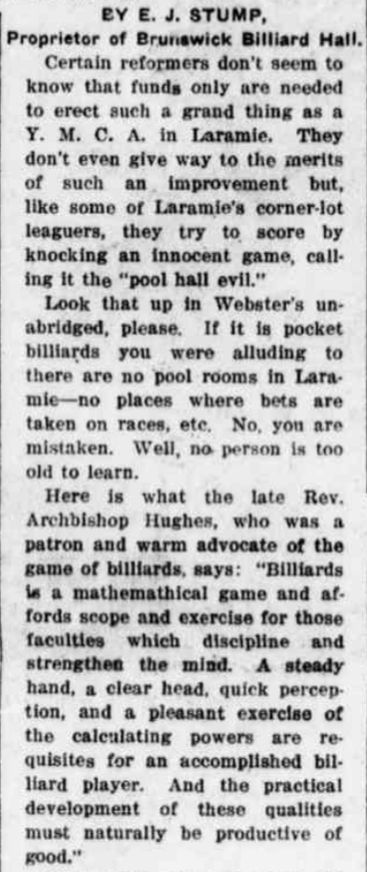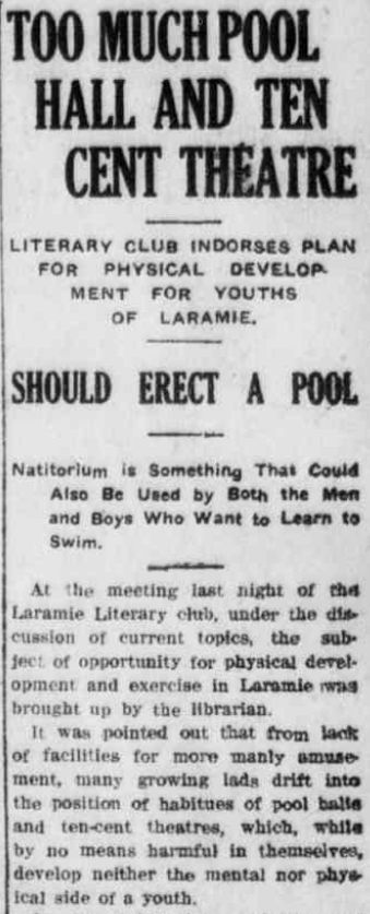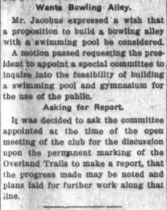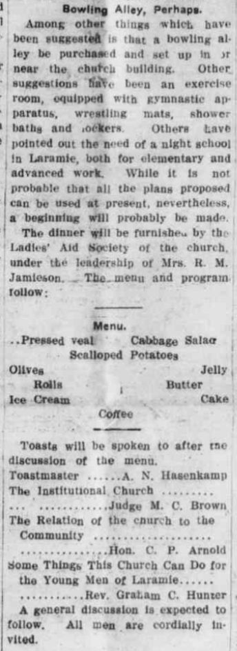 In May 1910, religious Laramie men had a meeting at the Presbyterian Church and suggested a bowling alley and gymnasium would be good. By October 1910, the Laramie Literary Club requested a committee to look into the feasibility of a swimming pool and bowling alley. In March 1912, religious Laramie men had a meeting and proposed a bowling alley and gymnasium in the basement of St. Matthew's Cathedral. In 1914, E. J. Stump, the bowling proprietor of the Brunswick Billiard Hall, mentions the YMCA efforts of Laramie men. In conclusion, I doubt these alleys were ever built, but the Laramie Country Club ten pin alleys may have its roots in these discussions. |
