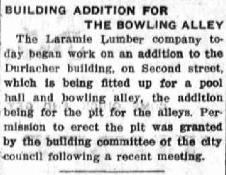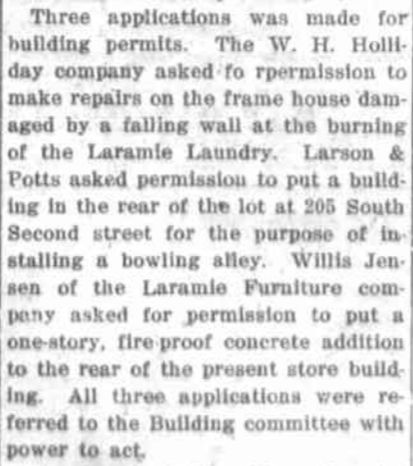 A few weeks later, the city's building committee approved the permit and the Laramie Lumber company began work on an addition which would be fitted with a pool hall and bowling alley. By late June 1913, the Mission Pool hall moved their contents from the Cameron building at 314 S 2nd Street to the Durlacher building (this location). By September 1913, the Mission Pool hall closed and the tables were moved to the Jacobs building (no mention of the bowling alley). In October, there was a For Sale ad to sell the pool tables and bowling alley that I attribute to this location. At this time, I suspect the arcade alley present at the first location (314 S 2nd) likely was never setup at this address as I found no mention of its use. Therefore, the permit might indicate a regulation alley was planned but never built. Note that this is the same address as F. W. Stroschein's bowling alley in 1912. |