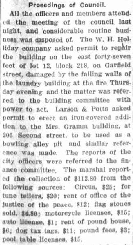 In early June 1913, Harry Larson and John Potts asked permission from the city to put a building in the rear of the